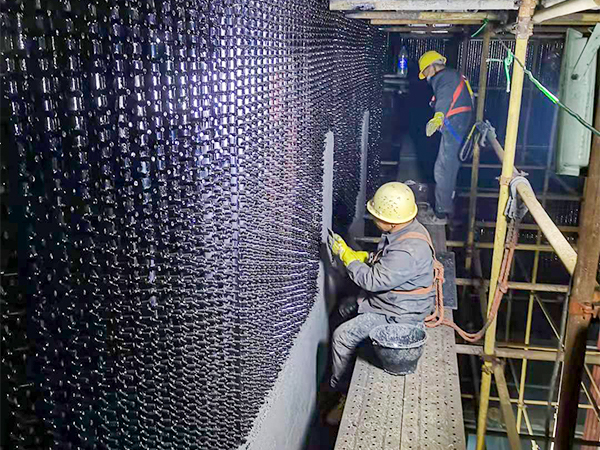 山西柳林循環(huán)流化床鍋爐砌筑項(xiàng)目 爐墻耐火磚砌筑 鍋爐內(nèi)襯抓釘焊接 不定形耐火材料施工效果 耐火材料出現(xiàn)開裂、脫落、···