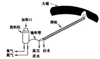 焊補設(shè)備主要由焊槍、混料機、操作控制盤、冷卻水加壓泵、高壓橡膠管組成。輔助設(shè)備有:均料機、耐材切割鋸、小型液壓站、冷卻設(shè)備等。工作條件要求:0.4MPa以上的純氧,0.02MPa的氮氣,1MPa的水壓。焊補工作示意圖見圖1。